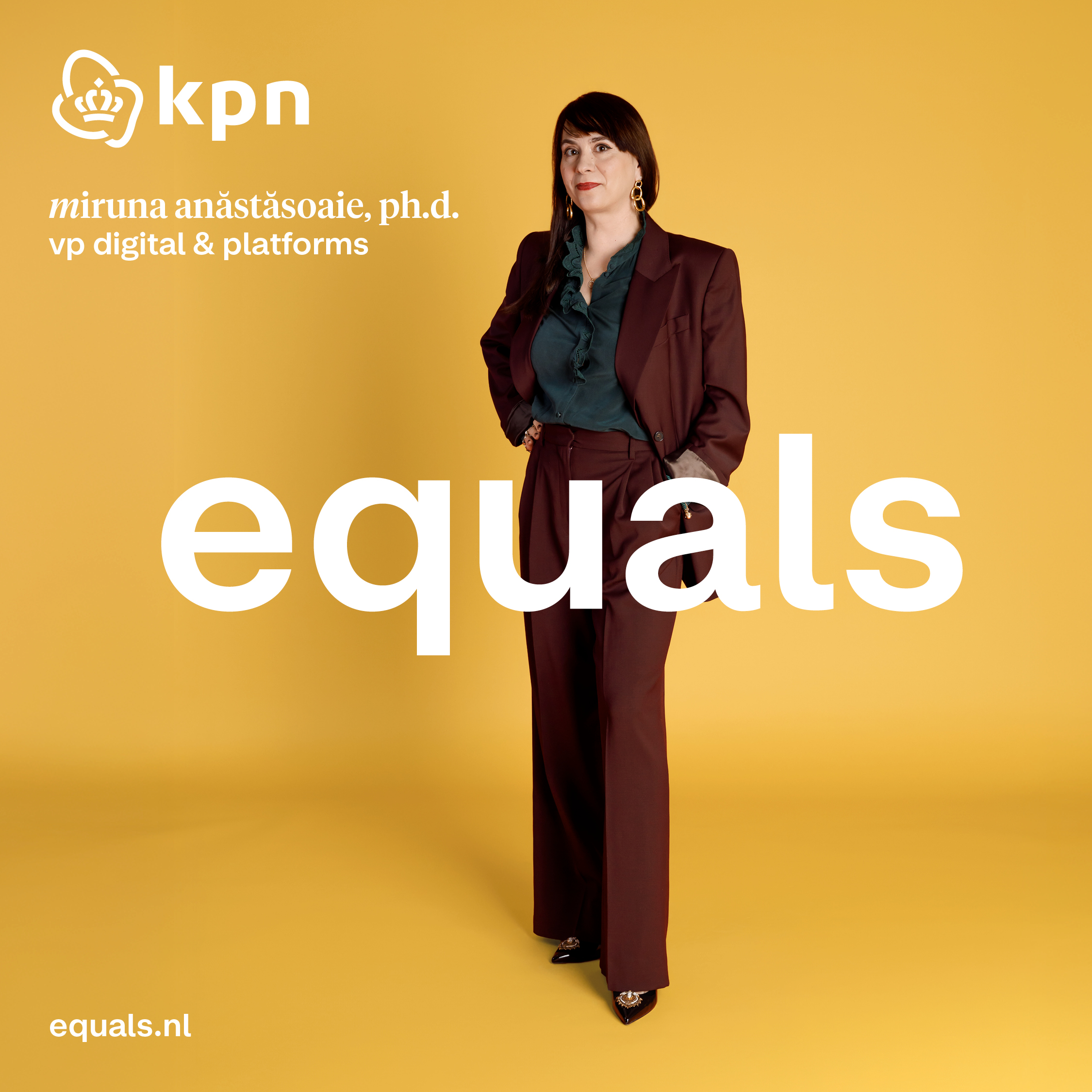 Dit jaar is Miruna Anăstăsoaie het gezicht van KPN in de Equals-campagne. Je ziet haar op verschillende plekken terug in Amsterdam en Rotterdam. Miruna is Vice President Digital & Platforms bij KPN. Zij zet zich in als rolmodel voor vrouwen in tech en maakt zich sterk voor inclusiviteit. Bij KPN zorgen we voor een plek waar iedereen zich veilig en welkom voelt. En wij geloven dat verschillen ons sterker maken. Diversiteit is voor ons geen doel, maar een kracht. Met de Equals-campagne laten we zien: vrouwen krijgen bij KPN alle ruimte om te groeien. Je hoeft niet in één hokje te passen om succesvol te zijn.